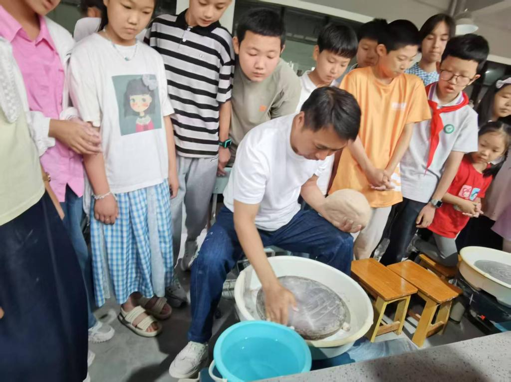 中心陶艺项目负责人谭玉辉老师,为小学生们分享了陶瓷知识和工艺,演示了陶瓷釉下彩绘画技法、拉坯实践,手把手指导小同学们进行了现场体验,沉浸在陶艺制作的乐趣之中。