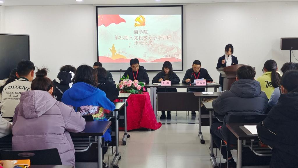12月2日,商学院第33期入党积极分子培训班开班仪式在S4-410教室隆重举行。商学院党总支鞠恒学副书记、学生党支部黄飞剑、王璐、范迎老师及101名入党积极分子参加了开班仪式。仪式由李善战老师主持。